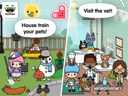 Подружитесь с животными в красочной детской игре Toca Life: Pets! Вас ждут 120 различных видов животных, начните весёлое времяпровождение вместе с ними! Устраивайте пикники на природе, купайтесь в речке и исследуйте таинственные пещеры. А если зверюшки приболели, то всегда можно подлечить их при помощи необходимых пилюль и сделать перевязку, если вдруг кто-то травмировался.