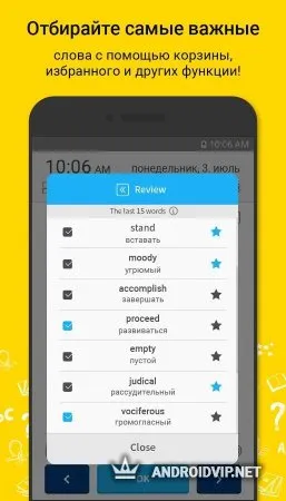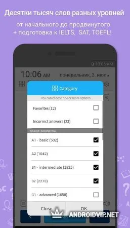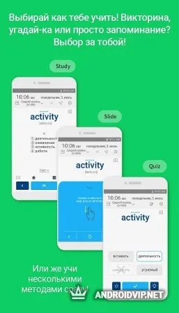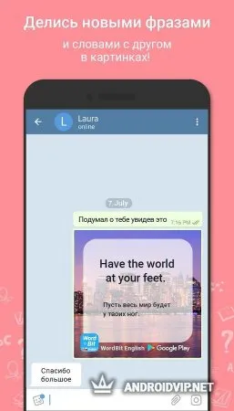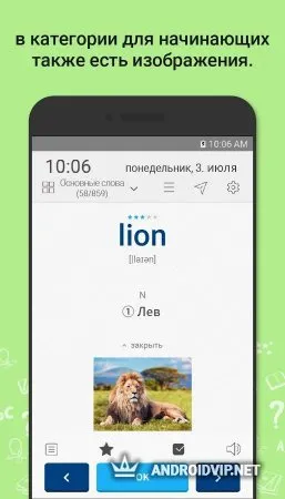 Учите значение и произношение английских слов для разных ситуаций: романтические фразы, бизнес фразы и ежедневные фразы. Выучите быстро и легко около 30 000 фраз, абсолютно бесплатно! Выберите удобный для вас режим в зависимости от уровня знаний и начните изучать новый для себя язык практически не тратя на это лишнего времени. Из полезных функций стоит отметить автоматическое прослушивание произношения слов и фраз, возможность отправлять выражения друзьям и 9 красивых разноцветных скинов на любой вкус.