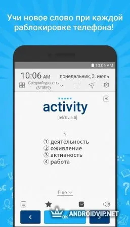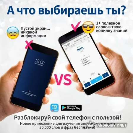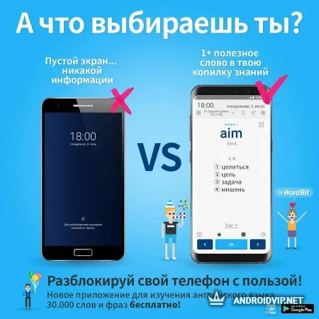 Наверняка многие и не задумываются о том, что экран блокировки вашего смартфона способен не только показывать текущее время, но ещё и обучать. Так, приложение Wordbit- Английский язык (на блокировке экрана) предлагает пользователям учить английский при помощи экрана блокировки! Активный пользователь мобильных устройств в среднем заглядывает в телефон около 50 раз, таким образом он за месяц сможет легко и без напряга выучить как минимум 1500 новых слов! Здорово, правда?
