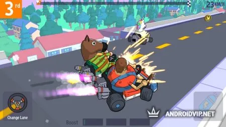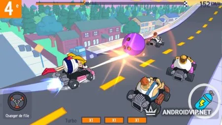 Коллекционируйте прикольные головные уборы: парики, маски, шляпы и не только. Также не забывайте открывать награды, ведь в них обязательно будет что-то полезное, типа улучшений, монеток или даже новый карт! Гоняйте с другими геймерами с любой точки мира, сколачивайте свои гоночные банды! Внешне игрушка выглядит как мультфильм, яркие краски и комичная атмосфера в миг поднимет настроение.