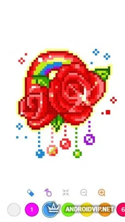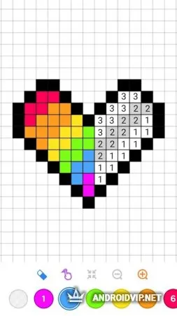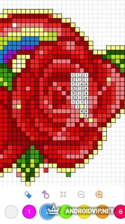 Цифры на каждом из её квадратиков обозначают тот цвет, которым нужно закрасить данную область. К примеру, цифра 1 - это фиолетовый цвет, 2 - синий и так далее. После того, как вы раскрасите изображение полностью, увидите полноценную цветную картинку. В приложении собрано очень много иллюстраций на самую разную тему. Выберите любимую тематику и получайте удовольствие от процесса раскраски.