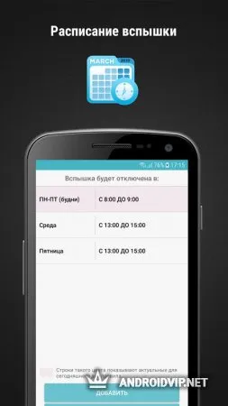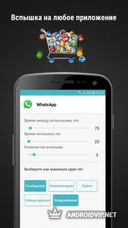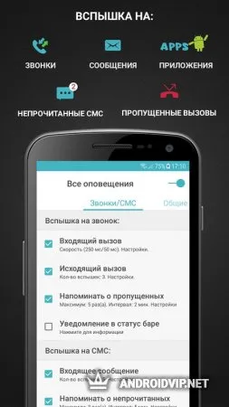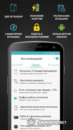 Вспышка на звонок и приложения - это способ сделать свой смартфон более заметным при звонках и запуске приложений, а также просто выделиться из толпы! Задействуйте на звонок вспышку своего телефона, причём вы можете активировать как заднюю, так и фронтальную или сразу обе. Настройте временной интервал между миганиями, время самой вспышки и отведённое время работы на звонки, также можно установить вспышку в качестве уведомления, если у вас появились пропущенные вызовы или смс. А если вы потеряли телефон где-то поблизости, то отправьте на него сообщение с текстом "flashon 30", где тридцать - это количество секунд. Вспышка включится, тем самым подав вам видимый знак о местонахождении девайса.