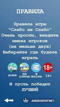 Слабо не Слабо - это простая и увлекательная игра, которая отлично скрасит вечер для компании друзей или как минимум двух человек. Запустите приложение и приготовьтесь к большому количеству забавных заданий!