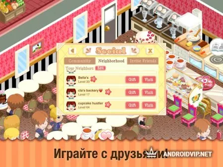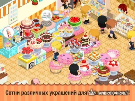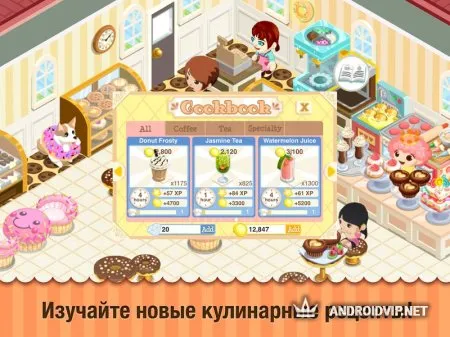Прибыль зависит от уровня настроения клиентов, поэтому нужно сделать максимально комфортные условия, организовать самую лучшую в городе кафешку, вовремя выполнять заказы и пожелания клиентов. Уровень настроения клиентов будет указан на шкале. Чем больше посетителей, тем больше прибыль заведения. Обновлять интерьер и пополнять меню новыми рецептами необходимо каждую неделю. Чтобы получать интересные бонусы, посещайте соседние заведения.