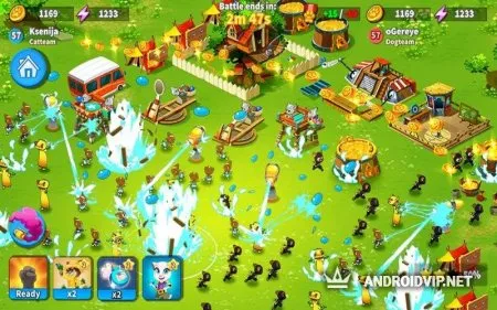 Особое внимание стоит уделить оборонительной части: вы сможете построить разнообразные защитные башни для уничтожения соперников, например разбрызгиватель, лужу, которая не даст врагу пройти, катапульту и множество других. Чем больше вы сможете создать таких башен, тем сложнее будет захватчикам подобраться на вашу территорию.