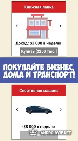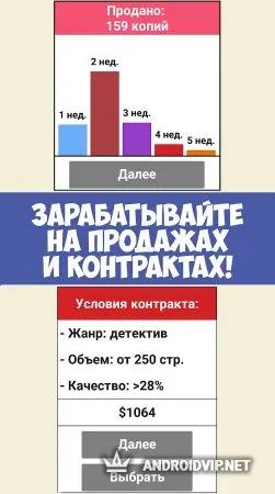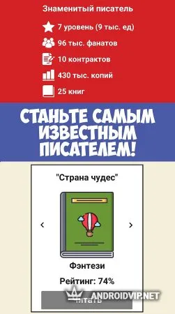 Со временем можно будет расширить своё дело до крупнейшей корпорации! Приобретайте недвижимость, транспорт и многое другое. Как вы видите, эта игра не только интересный симулятор писателя, но ещё и в какой-то мере симулятор жизни. Скачайте её и окунитесь в увлекательный геймплей, старательно созданный отечественными разработчиками.