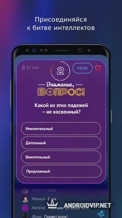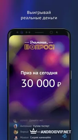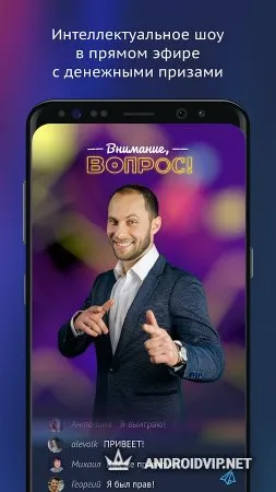 Внимание, вопрос! - онлайн шоу - это викторина, в которой вы можете своим умом заработать настоящие деньги. Чтобы выиграть денежные призы, необходимо первым правильно ответить на все вопросы, которые появятся в прямом эфире. Прямой эфир проводится каждый день в 19:40 по Московскому времени, за 5 минут до начала вам придёт уведомление. Если вопрос для вас сложный или вы сомневаетесь в ответе, вам поможет подсказка 50 на 50, которая уберёт два неверных ответа из четырёх вариантов. Играйте и выигрывайте!
