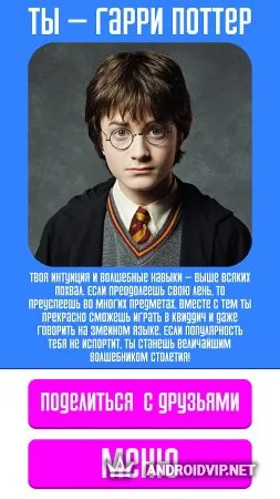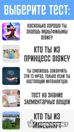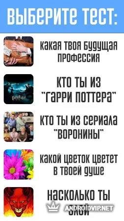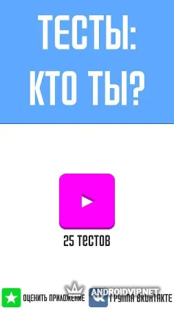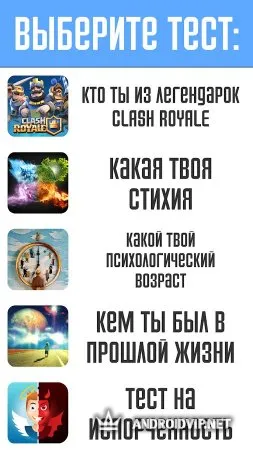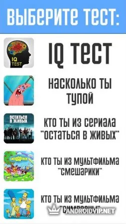 Тесты: Кто ты? - это увлекательная викторина, в который вы узнаете о себе много интересного. В этом приложении содержится множество разнообразных тестов, выберите из них те, которые вам по душе и пройдите их, чтобы ближе познакомиться со своим внутренним "я", ведь порой, мы и не догадываемся, как плохо мы себя знаем. Вот примеры некоторых тестов: IQ-тест, на какого героя сериала "Смешарики" ты больше всего похож", кем ты был в прошлой жизни, тест на испорченность, определи свою стихию, психологический возраст и многие другие.