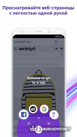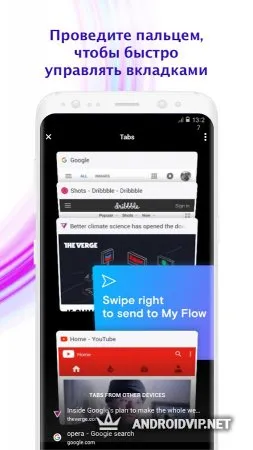 Как уже упоминалось выше, Opera Touch настроена на работу одной рукой. Чтобы перейти к быстрому поиску, просто тапните на кнопку быстрого действия, которая всегда на виду. А если на неё нажать и потянуть, для вас откроются недавно используемые вкладки браузера, а также возможность обновить страничку, закрыть активную вкладку или отправить её себе на компьютер.