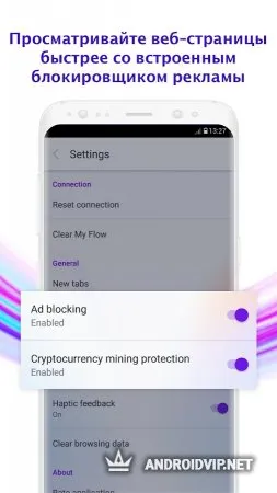 Для тех, кто не может представить сёрфинг в интернете без блока рекламы, здесь есть надёжный встроенный блокировщик, который устраняет надоедливые рекламные баннеры, тем самым не только сберегая нервные клетки юзерам но и ускоряя загрузку страниц.