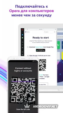 Используя данный браузер в связке с Опера на компьютере можно легко переключаться между этими устройствами. Синхронизация содержимого на этих девайсах ещё никогда не была такой быстрой и простой. Просто перезапустите Opera на ПК и отсканируйте изображённый QR-код используя Opera Touch без логинов, паролей или учетных записей. Легко и без лишних "танцев с бубном".