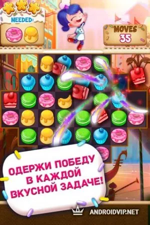 Как и во всех играх подобного жанра, игрокам предстоит собирать на игровом поле в одном ряду по три и более одинаковых «вкусных» элементов – кексов, печенек, пончиков, пирожных и других сладостей. Чтобы заработать как можно больше игровых баллов, получить ценные бонусы, призы и улучшения, необходимо совместить как можно больше сладостей за один ход.
