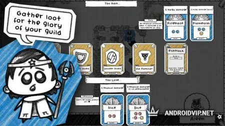 В сражениях нет никаких тактик. Враги имеют свои классы, уникальные свойства. Перед боем противник предъявляет свои требования, игрок делает выбор, отвечая соответствующими картами. Исход боя зависит от удачи и карт колоды. После победы игрок получает предметы из экипировки. Полученное золото идет в фонд Гильдии, поверженный герой – на кладбище и его место занимает новый юнит, готовый к подвигам.