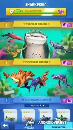 Hungry Shark Heroes - вы готовы изучить глубины морей с тысячами голодных акул и создать своё пристанище для этих хищных созданий? Тогда начнём! Выберите местечко попросторнее и начните разводить уникальных акул! Отправляйте их изучать океан и сражаться с другими игроками в режиме ПвП! Битвы будут проходить на 15 разнообразных аренах, среди которых ледяные пещеры, храмы Атлантиды и другие. Соберите всех 120 с лишним опасных рыбин, включая древнего Мегалодона! Это будет поистине впечатляющая коллекция, которая повергнет всех соперников в шок и заставит пятиться назад!