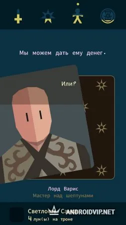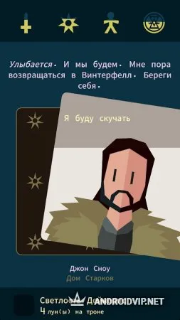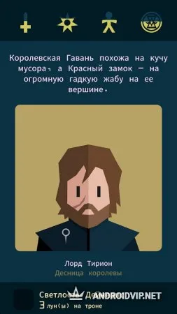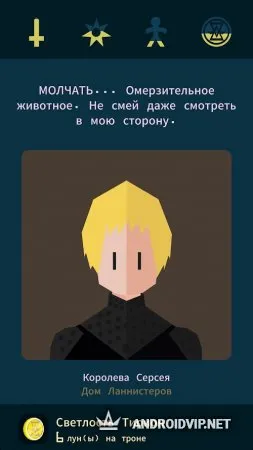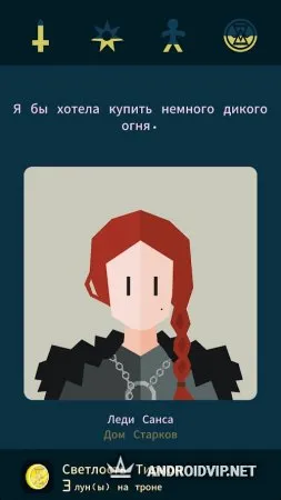 Reigns: Game of Thrones - это новая игра, в основу которой легли события культового сериала и конечно же, все знаменитые герои этой саги. Станьте и вы участником коварных интриг между членами Семи Королевств. Здесь важны хладнокровие, хитрость и сила, только так можно пройти нелёгкий путь, жирной точкой в котором будет ваше знамя, гордо сияющее над миром. Используйте свою мощь и диктуйте буквы своего закона, чтобы оказывать влияние на людей и принимать нужные решения для укрепления своей власти. Но учтите, у каждого принятого вами решения будут свои последствия. В этой игре вас ждут несколько различных концовок, которые могут удивить даже самых преданных поклонников этого сериала.