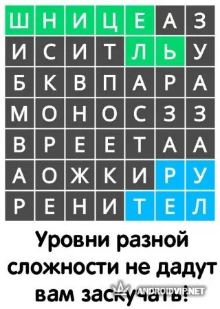Найди слова - новая игра со словами, по своей сути схожа с венгерским кроссвордом. Ваша задача - определять слова в квадрате и выделять их. По традиции, первые уровни будут самыми лёгкими, затем сложность будет увеличиваться в геометрической прогрессии. Но если вам стало уж очень сложно, разработчики предусмотрели подсказки. Разнообразия придаёт большое количество тематик, состоящих из трёх десятков категорий, около 700 уровней и почти 5000 слов! Интерфейс простой и приятный, позволяет вникнуть в правила с первых секунд. Вооружитесь своим умом и отыщите слова там, где казалось бы, их нет. Успехов!