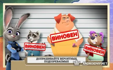 Помимо главных героев, здесь вас ждут такие персонажи Зверополиса, как располневший гепард-коп Когтяузер, его коллега, грозный Носорожес, их суровый капитан Буйволсон, тот самый ленивец-оператор Харриет и другие.