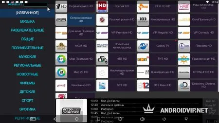 Интерфейс программы Фрай ТВ очень прост и удобен, при его помощи можно без труда найти интересующий канал. К каждому каналу есть программа передач, возможность составить свою сборку телеканалов и другие приятные функции.