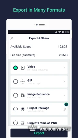 Экспорт в высоком качествеПриложение поддерживает экспорт видео в форматах Full HD и 4K без водяных знаков, что особенно важно для тех, кто создает контент для профессионального использования или публикации в социальных сетях.