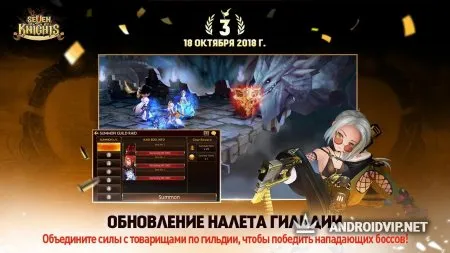 Ну и какие же сражения без боссов? Можно совершать налет на главаря в одиночку или всей командой. Также можно вести счет боя, где сравниваются результаты всех игроков, которые сражались с тем или иным боссом. Опыт, прокачка и рост персонажа – все это доступно каждому, кто будет путешествовать по игровому мир Семи Рыцарей.