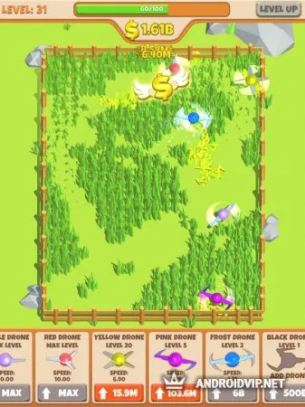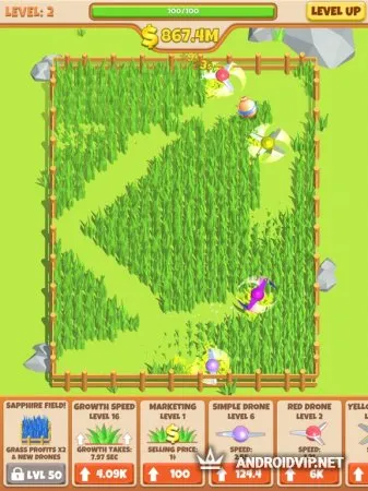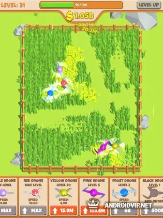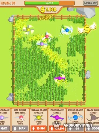 Принцип игры прост – скашивайте траву любыми доступными способами, чтобы получить бонусные очки и перейти на следующий уровень. В самом начале у игрока есть только один вид газонокосилки – двухгранный триммер, который напоминает спиннер. Далее можно приобретать косилки разных моделей и мощностей.