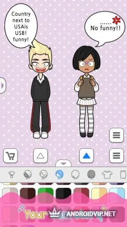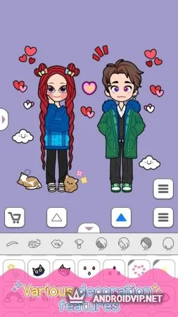 Можно создать одного или двух персонажей предпочитаемых полов. С помощью функции перетаскивания создаём образ нашим человечкам, среди которых такие функции, как: создание прически, цвета кожи, ушей, крыльев, обуви, верхней и нижней одежды. Также можно использовать различные аксессуары и предметы макияжа.
