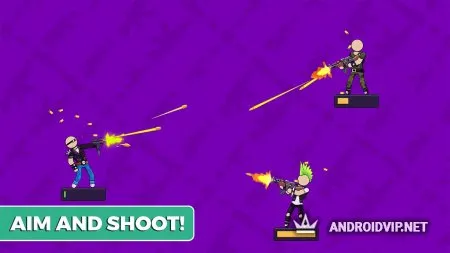 Теперь можно приступить непосредственно к перестрелке. Наводим оружие на врага и стреляем. После убийства каждого из них, ваш стикмен будет получать несколько монет. Наверху можно увидеть количество убитых врагов, кнопка в правом нижнем углу позволяет перезарядиться, а как только главного героя убьют, то матч закончится.