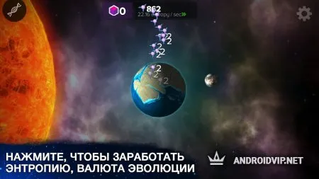 Начиная с одной клетки, и заканчивая сингулярностью, пройдите этот эпический путь истории эволюции. С каждым нажатием игрок будет получать Энтропию – это эволюционная валюта, которая помогает в продвижении. Управление позволяет освоить азы игрового процесса даже новичкам.