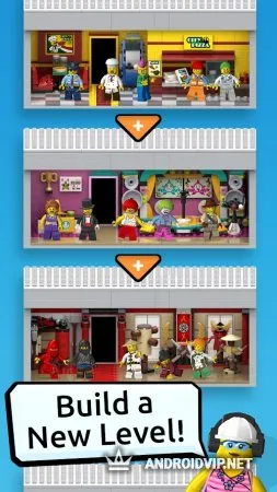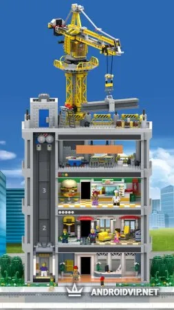 Каждый этаж большой башни состоит из уровня, который будут занимать фигурки. Например, первый этаж занят пиццерией, второй оснащен офисным оборудованием, а с третьего этажа начинается жилой комплекс и так далее. В башне может быть бесконечное количество уровней, которые можно развивать.