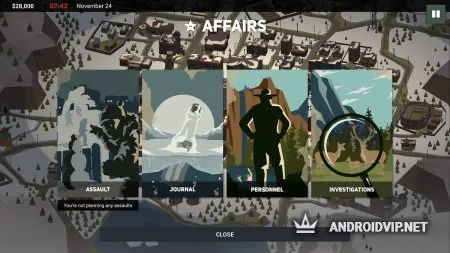 В игре также присутствует тактическая составляющая. В то время, как ваши сотрудники будут выполнять простые задания, которые не требуют особого контроля, все будет хорошо. Но как только в городе начнутся деяния различных преступных группировок, вам придётся взять управление на себя.
