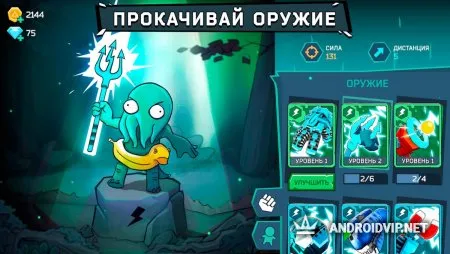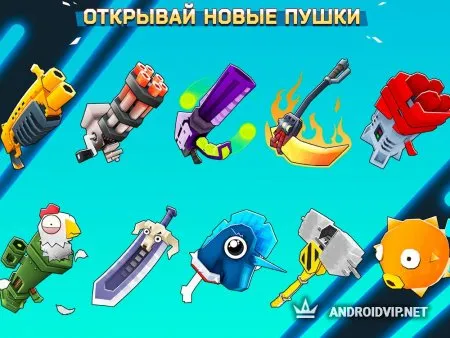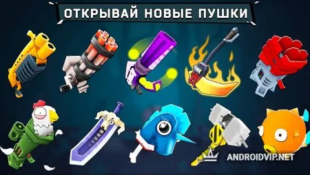 Что касается оружия, тот тут разработчики дали волю воображению. Если вам надоело типичное оружие по типу пистолетов, автоматов и пулемётов, то предложенные данной игрушкой варианты вам уж точно понравятся! Можно расправиться с соперником дохлым единорогом, электрическим трезубцем или запихать рыбу-бомбу ему куда-нибудь, да поглубже!