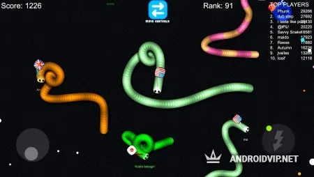 Простое управление не вызовет затруднений: используйте лишь один палец, чтобы управлять своим змеем. Регулировка скорости происходит за счёт приближения центра виртуального джойстика к границам круга.