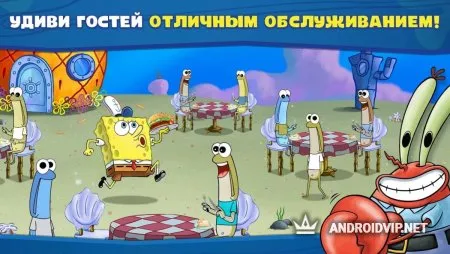 Между переходами от уровня к уровню, вам предстоит развивать собственные фаст-фуд рестораны – их можно кастомизировать под свой вкус. Помимо основной задачи Губка Боб также сможет разносить готовые блюда своим клиентам. Радуйте своих посетителей хорошим качеством готовых изделий и быстрым обслуживанием!
