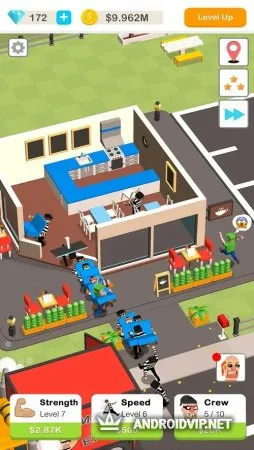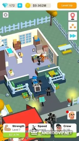 Чем быстрее вы выполните свою грязную работёнку, тем больше кристаллов получите. Также камешки даются за различного рода дополнительные задания. За кристаллы можно приобретать в свою бригаду более проворных воришек, которые будут добывать вам награбленное в разы эффективнее.