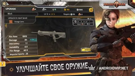 Повышайте уровень своего персонажа, параллельно с приобретением лучшего оружия и экипировки. Выбор средств атаки вас обрадует. Есть всё, от катаны до винтовок и осколочных гранат. Каждое оружие поддаётся модернизации. Вы можете оснастить его глушителем, дополнительной рукояткой или прицелом.