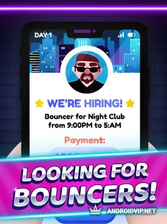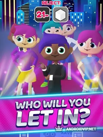 Поищи подходящие вакансии и устройся вышибалой в крутой клуб! Следи, чтобы на танцпол не прорвались пьяницы, босые посетители и другие персонажи непотребного вида. Хозяин заведения очень требовательный человек, и следит за тем, чтобы контингент соответствовал всем требованиям. Кстати, требования могут быть разные, к примеру: пускать людей только в красной одежде, в возрасте от 21 года и выше, без выпивки.