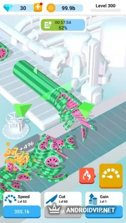 Получите эстетическое удовольствие от идеальной шинковки продуктов. Процесс можно прокачивать по таким показателям, как скорость нарезки и острота ножей. Следите, чтобы работа проводилась качественно, расширяйте производство и зарабатывайте больше и больше денег.