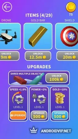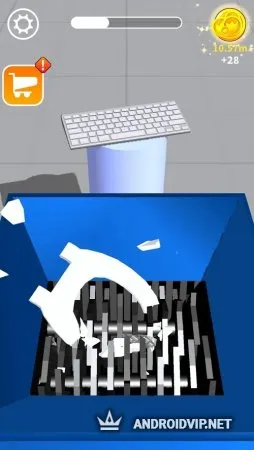 Режьте всё, что душа захочет! Еду, игрушки, гаджеты и даже сантехнику! Можно настраивать шреддер по уровню мощности, скорости и другим параметрам. Чем больше предметов вы превратите в груду обломков, тем больше денег заработаете. Вот так можно совместить приятное с полезным.