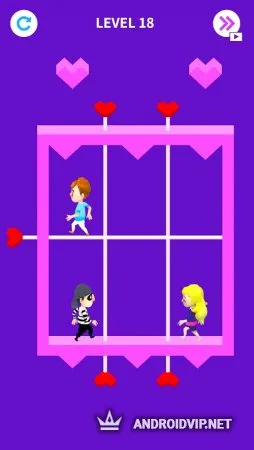 К примеру, будет уровень, где перед вами будет нечто вроде помещения с несколькими этажами. На разных концах этого дома находятся парень и девушка, которые должны встретиться. Однако помимо них там находятся несколько плохих персонажей - преступников, которые ни в коем случае не должны встать на пути нашей пары. Все они находятся на своих точках, изолированных друг от друга перегородками. Уберите эти перегородки так, чтобы плохи парни отсеялись, а пара в итоге воссоединилась. Удачи!