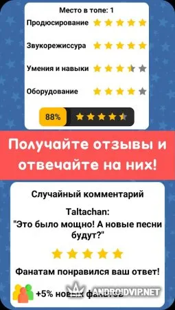 У вас есть отличная возможность начать свой музыкальный путь в любом из жанров, будь то поп музыка или тяжёлый метал. Повторите путь Bring Me The Horizon или станьте одним из популярных рэперов. Процесс создания основной композиции очень простой: вам достаточно выбрать общий жанр, выбрать его подразделение и дать оригинальное название. Вам не придётся заниматься сведением и мастерингом, ведь всё осуществляется в два клика! Опять же, прослушать готовые произведения нельзя – игровая условность.