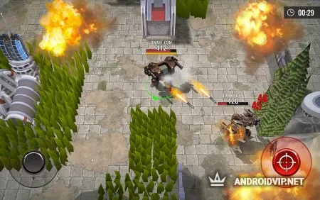 Из управления можно выделить лишь два виртуальных джойстика: один для передвижения и второй для атаки. К слову, атака у каждого робота уникальная: кто-то запускает целую очередь маленьких снарядов, а кто-то запускает единожды мощную ракету. Большинство снарядов можно пустить в молоко, если противник успеет зайти за стенку.