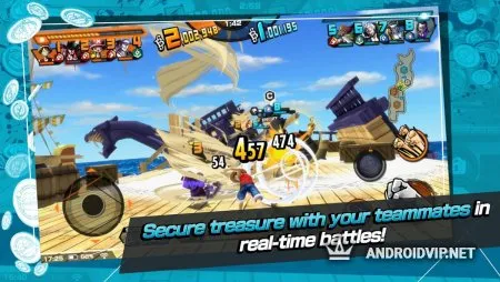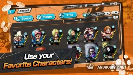 Персонажей в игре много и все они взяты из вселенной One Piece. Однако, они подразделены на пять классов: боец, сторонник, воин, стрелок и фехтовальщик. Кто-то будет полезен в ближнем бою, а кому-то лучше держать средние дистанции. Присутствует система развития для каждого бойца. Полученный в сражениях опыт идёт в шкалу прокачки персонажа, за которого вы сражались. Чем выше уровень – тем мощнее герой. Не стоит забывать, что внутриигровые предметы также дают некоторые бонусы в бою.