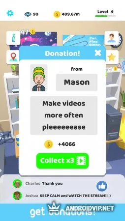 Общайтесь со своими фанатами, проводите различные ивенты и ваши поклонники будут постоянно следить за вами в ожидании нового материала. Только без грубостей, иначе подписчики могут покинуть ваш канал. Кликайте по экрану, собирайте монеты и зарабатывайте кучу денег на своих стримах.