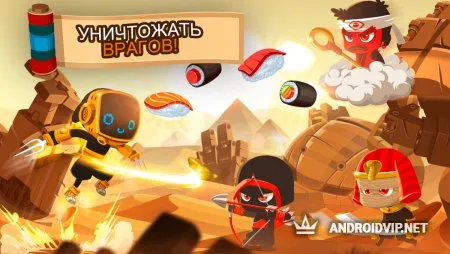 Присутствует система улучшения. За каждого побежденного противника будет начисляться несколько очков опыта. Для перехода на следующий уровень персонажа каждый раз потребуется все больше и больше очков. Повышение уровня заметно повышает количество очков здоровья, а также даёт некоторые другие преимущества. Героев в виде ниндзя в игре довольно много. Вам предстоит разблокировать их всех: некоторые можно приобрести за внутриигровую валюту, а других только выбить после тяжелого сражения. Устанавливайте эту весёлую аркаду с ниндзя и отправляйтесь за потерянными суши!