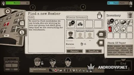 Пусть ваши действия и не совсем значительны, но их много: расклеивайте листовки, срывайте вражеские плакаты, проводите диверсии на складах, собирайте информацию из особых мест и так далее. Высылая агента на задание, придётся оценить множество факторов: риск попадания в плен, скорость, время суток и так далее. Для успешного выполнения задания необходимо грамотно подобрать стратегию.