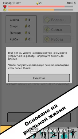 Проходя жизненные этапы, очень важен период молодости, когда многие люди проходят обучение в различных колледжах или других заведениях. Главного героя можно смело отправить в какой-нибудь престижный ВУЗ и помогать ему в учебе, но никто не мешает сразу отправиться на работу по достижению работоспособного возраста. Не стоит забывать и про стаж с пенсией – если персонаж доживет до старости, то пенсия будет очень кстати, но для достойных выплат необходимо отработать 15 лет.