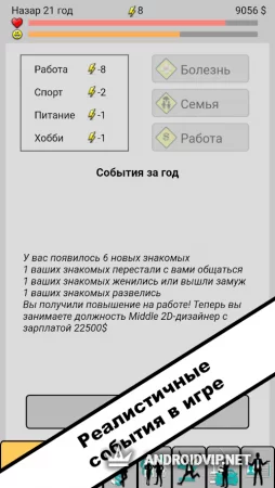 Семейная жизнь настигнет главного героя в тот момент, когда он найдет себе вторую половинку и заведет детей. Хорошее дополнение для семьи – собственный дом с большой площадью. Оставляйте след в истории после себя и попробуйте дожить хотя бы до пенсии в Симулятор жизни. New Life 2!