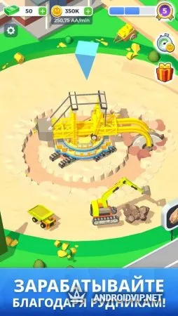 Покупайте новые виды добывающих устройств, размещайте их на объектах и увеличивайте добычу полезных материалов, которые можно продавать за серьезные суммы на мировом рынке. Локаций для добычи довольно много: можно разместить карьер недалеко от большого города и часто наблюдать проезжающие машины, либо же установить машины для добычи в пустыне – и там ископаемые найдутся.
