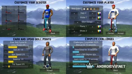 Как же без кастомизации главного героя? Меняйте его внешность - одежду и аксессуары, и конечно же, меняйте внешний вид самоката. Выполняйте красивые трюки и набирайте очки опыта, чтобы ваш скутерист становился ещё более мастеровитым.