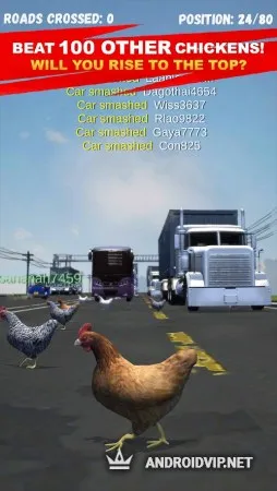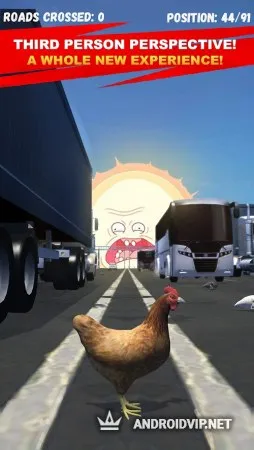 Постарайтесь перебежать дорогу максимальное количество раз, собирайте бонусы и уклоняйтесь от гигантских фур. Открывайте новые скины для своих кур и получайте удовольствие от забавного игрового процесса. В планах разработчиков добавить скины уток, роботов и игрушечных машинок.